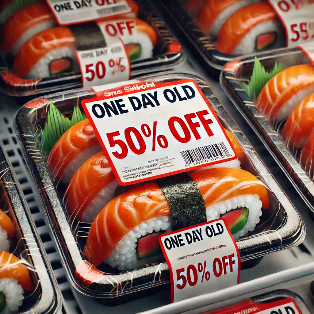 출처: DALL-E3 - 초밥 포장지에 "하루가 지났다는 내용과 50% 세일 한다는 내용"을 담은 장면