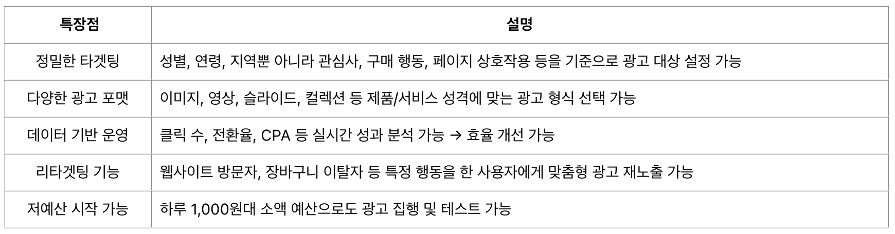 - ‘광고 관리자’에서 실시간 데이터 확인 가능 : 노출수, 클릭수, 전환수, 클릭률(CTR), 전환당 비용(CPA) 등