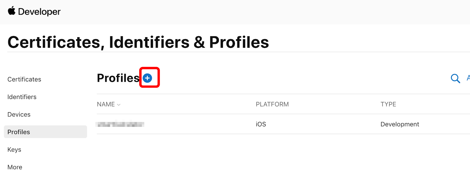 Provisioning Profiles를 생성하기 위해 Certificates, Identifiers & Profiles 페이지로 접속 후 왼쪽 Profiles 선택 후 + 버튼을 눌러주세요. (개발자용, 배포용 발급을 위한 과정, 2번 진행)