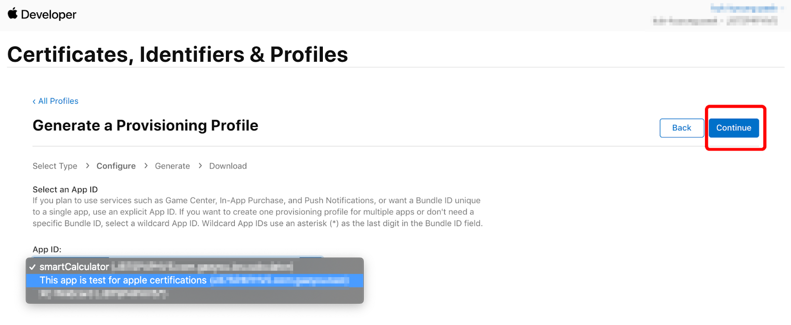 앞에서 생성한 App ID를 선택하고 Continue를 눌러주세요.