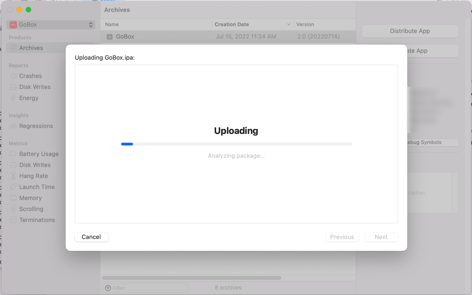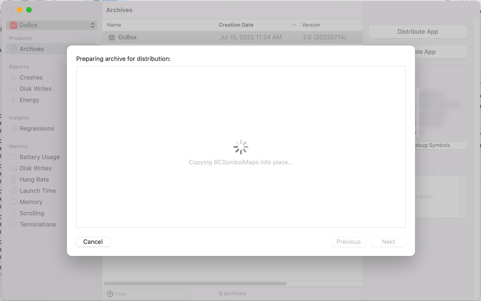 Archive를 선택하면 Archiving 진행되면서 빌드 작업이 진행됩니다.