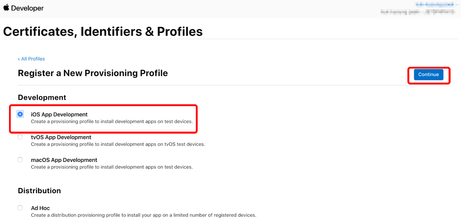 Development > iOS App Development를 선택하고 Continue를 눌러주세요.