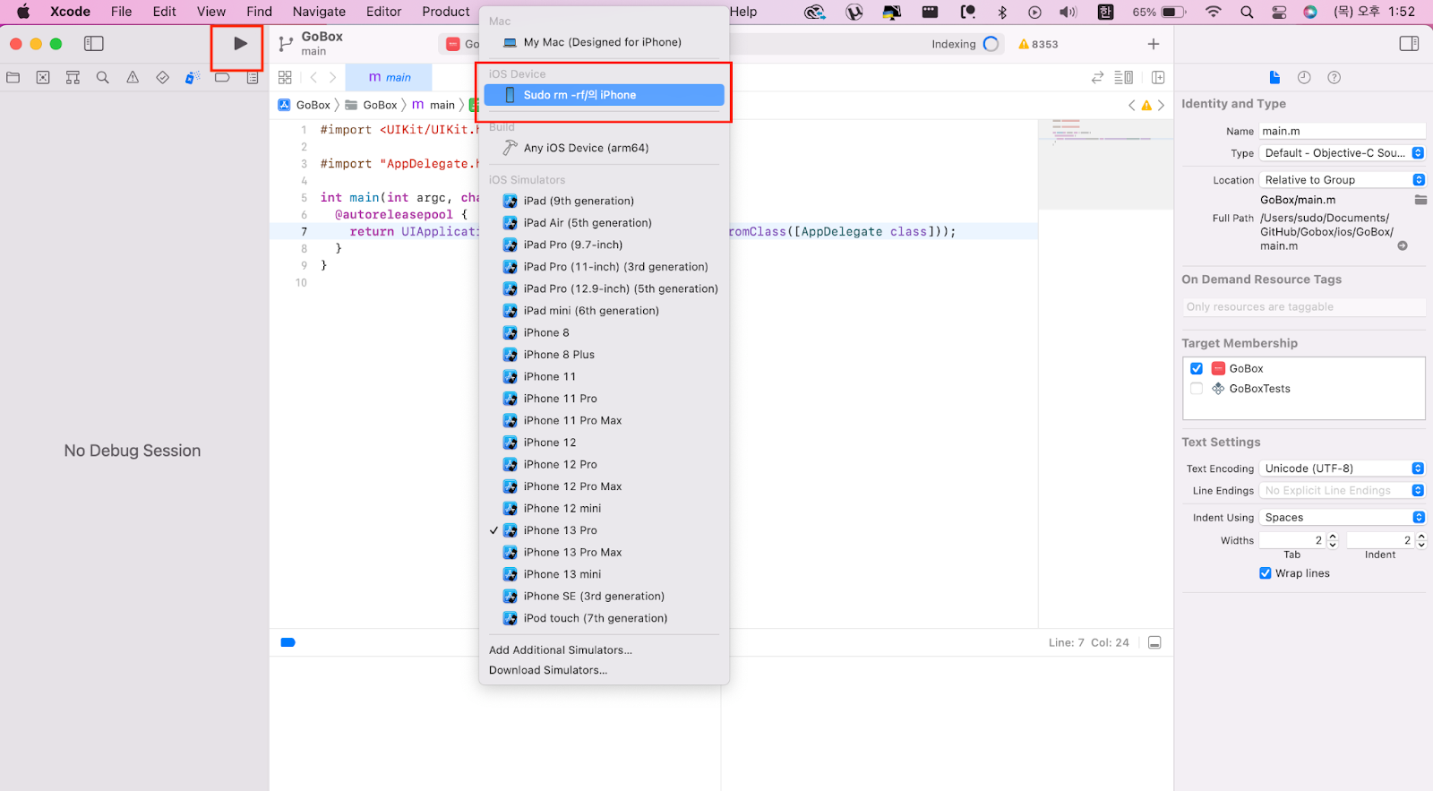 디바이스는 아이폰 혹은 아이패드를 맥에 유선 연결 후 Xcode를 실행해 주세요. 그다음