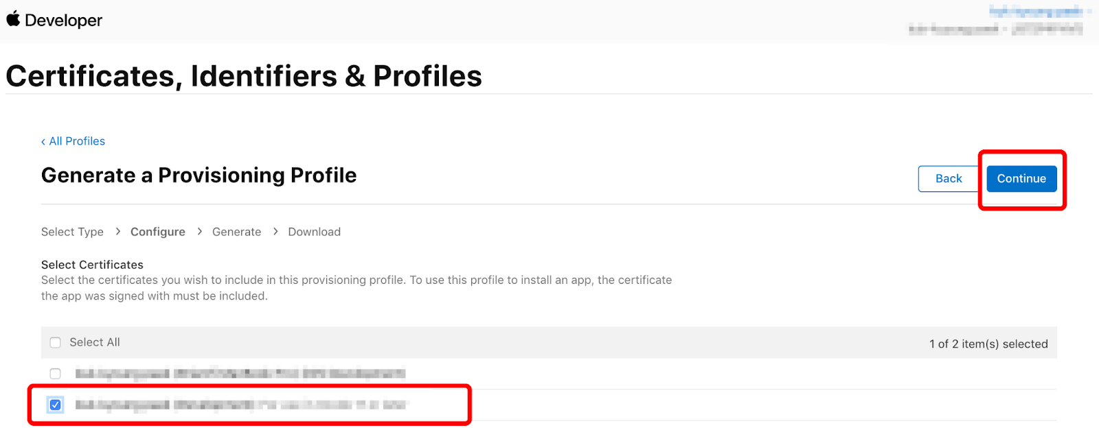 앞에서 생성한 Certificate를 선택하고 Continue를 눌러주세요.