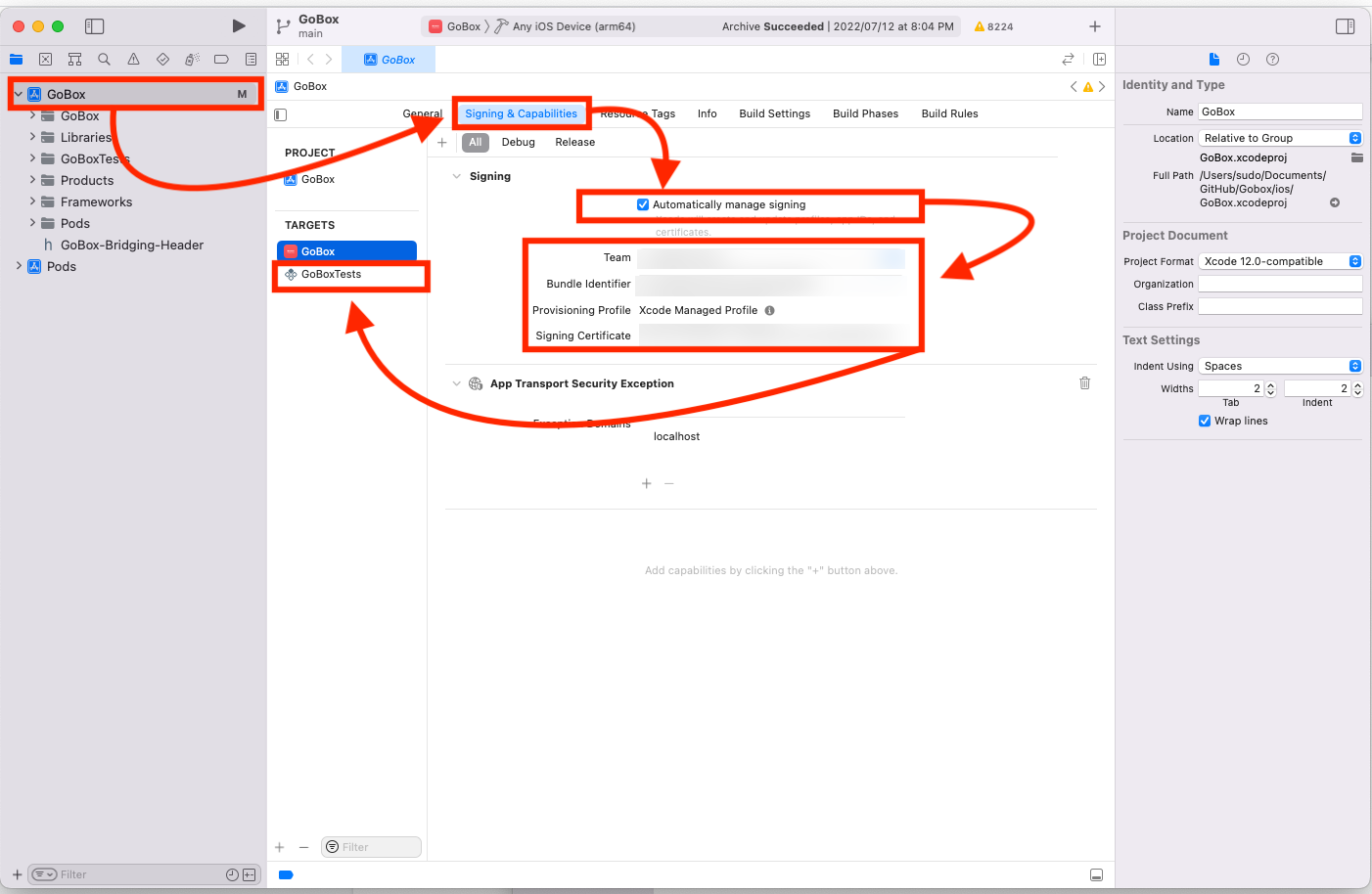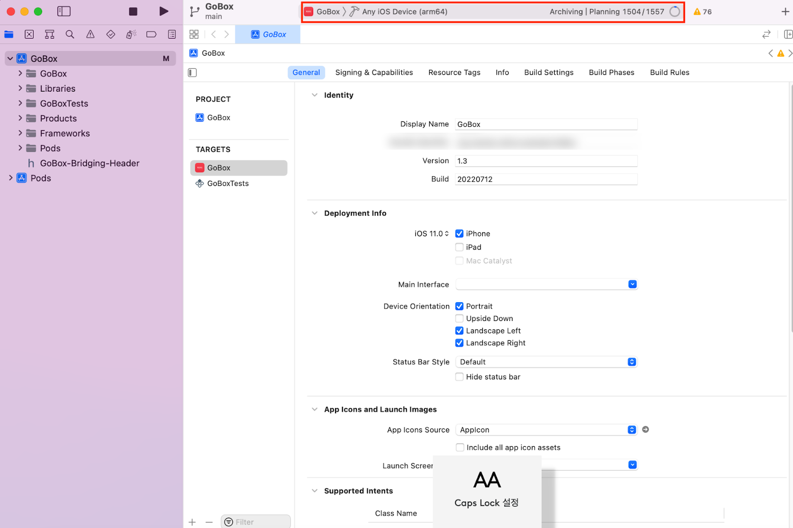 - 왼쪽 GoBox 클릭 후 Signing & Capabilities 클릭 후