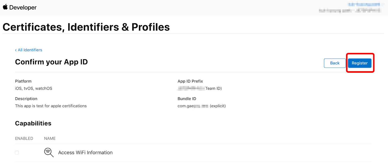 - Bundle Idenifier 은 개발자 프로파일 설치하면서 입력했었던 Bundle ID 입력
