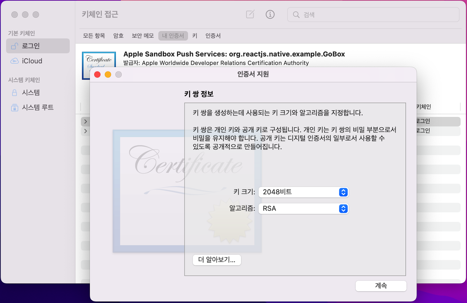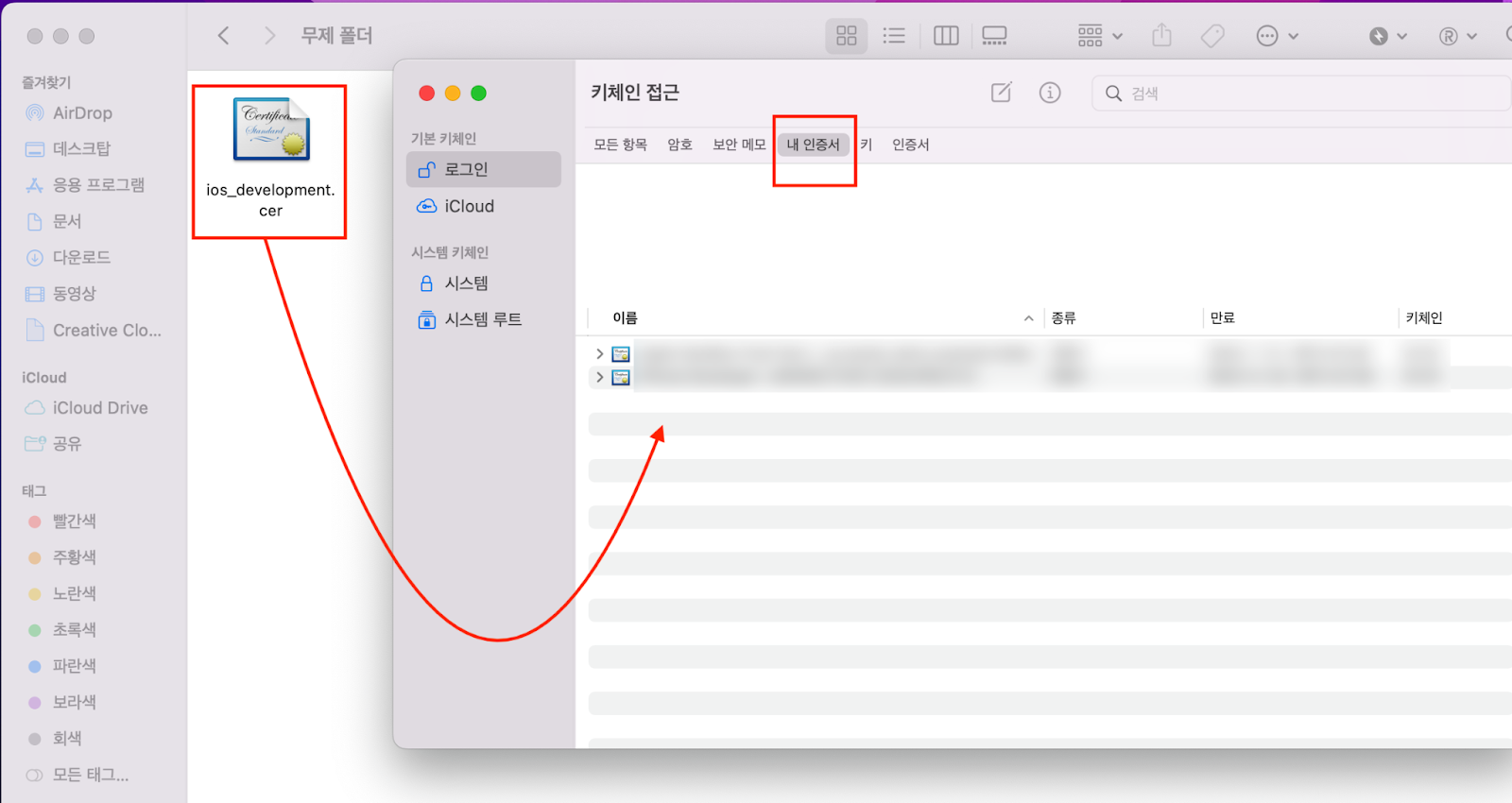 첫 단계에서 실행했었던 키체인 접근을 다시 실행하신 다음 방금 전에 저장한 개발자 인증서를