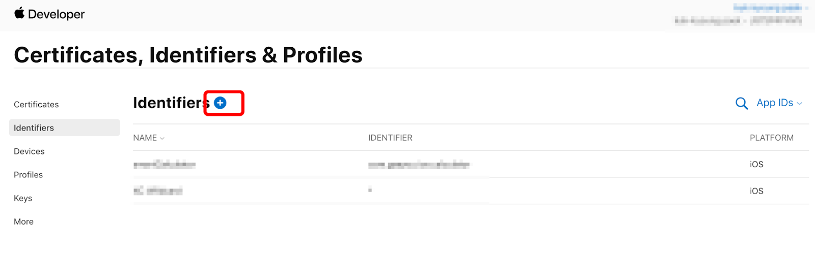 Identifiers 클릭 후 + 버튼을 클릭해주세요.