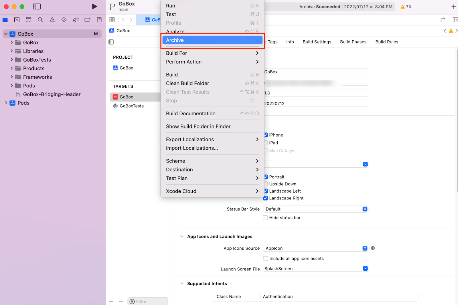 상단 메뉴바에 Product > Archive를 눌러주세요.