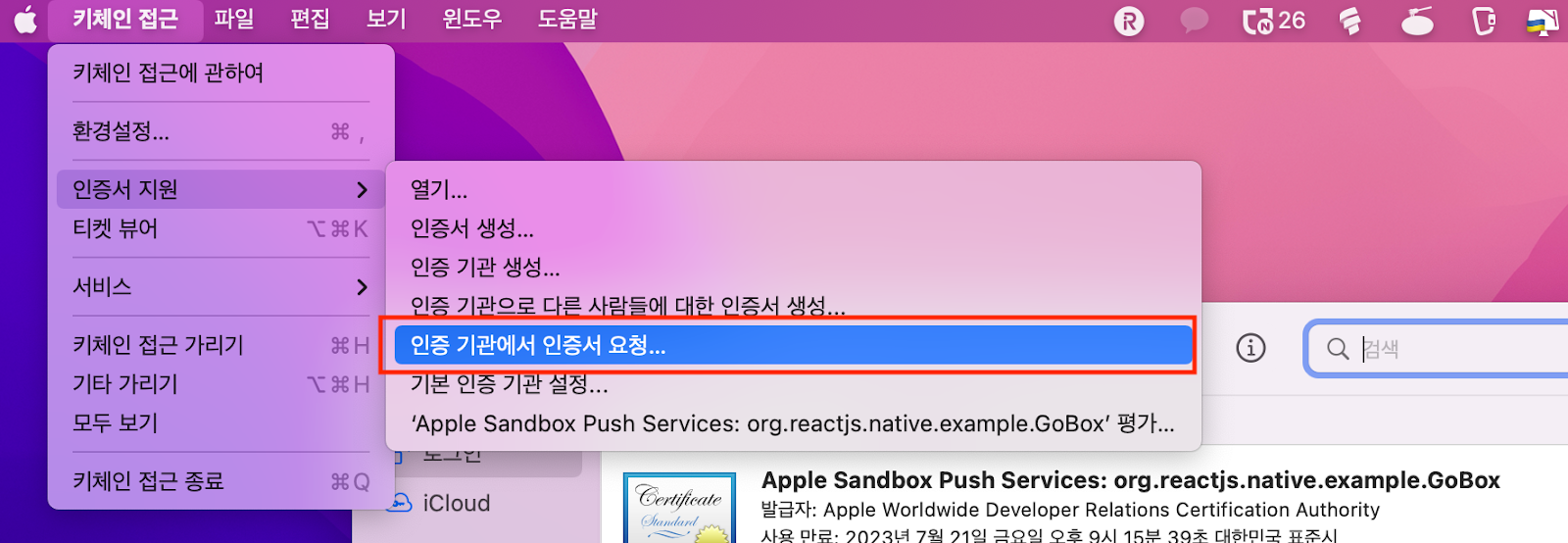키체인 접근 실행 후 상단 메뉴바에서 키체인 접근 > 인증서 지원 > 인증 기관에서 인증서 요청을 클릭해주세요.