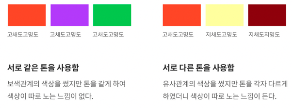 유사색이나 보색 상관없이 톤을 같이 쓰면 색상이 서로 따로 노는 걸 막을 수 있습니다.
