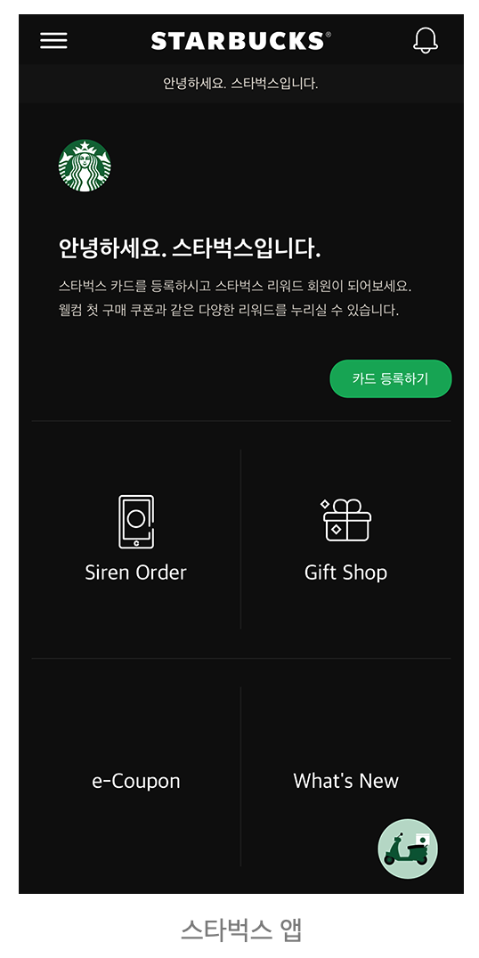 스타벅스 Mobile 디자인을 보면 배경색인 검정색이 60%, 보조색으로 흰색이 30%, 주색으로 녹색이 10% 사용된 것을 볼 수 있습니다. 주색인 녹색은 스타벅스의 브랜드 아이덴티티를 보여주는 색으로 카드 등록같은 버튼에도 사용되었습니다.