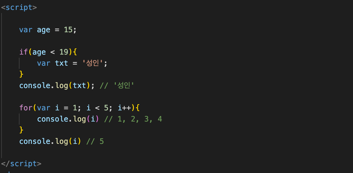 var는 함수(function) 안에서 쓴 것만 지역변수로 올려두고, 나머지 for 문, if 문 등등에서 쓰인 것은 다 전역변수로 사용합니다. 유일하게 벗어날 수 없는 스코프가 함수(function)입니다.