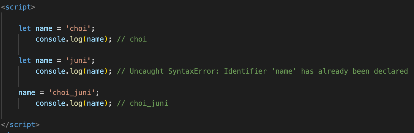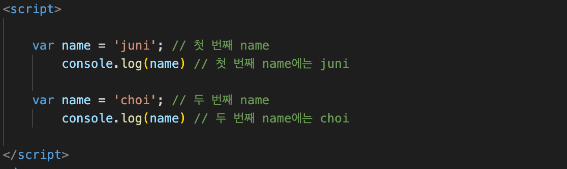 위 예제와 같이 name을 중복해서 선언해도 에러가 발생하지 않습니다. 이는 협업을 통한 개발 혹은 코드가 많은 상황에서 작동이 안 되는 상황이 발생하게 되면 수많은 코드를 일일이 확인해서 수정해야 하는 문제가 발생할 수 있습니다.