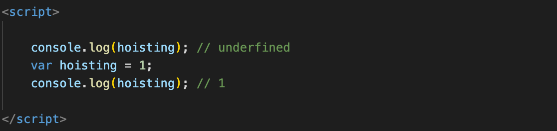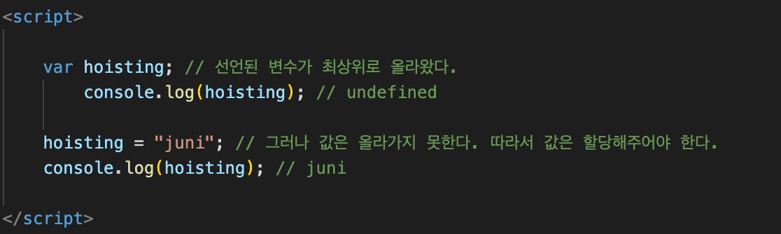 JavaScript가 실행될 때 어떤 변수랑 함수가 있는지부터 싹 훑어서 기억해두고 후에 누군가 hoisting이라는 변수를 부르면 자바스크립트가 기억해둔 변수랑 함수에서 찾아주는 것을 말합니다. 그렇지만 변수 할당된 값은 찾지 못해서 underfined가 나오는 걸 볼 수 있습니다. 호이스팅을 설명할 땐 주로 변수의 선언과 초기화를 분리한 후, 선언만 코드의 최상단으로 옮기는 것으로 말하곤 합니다.
