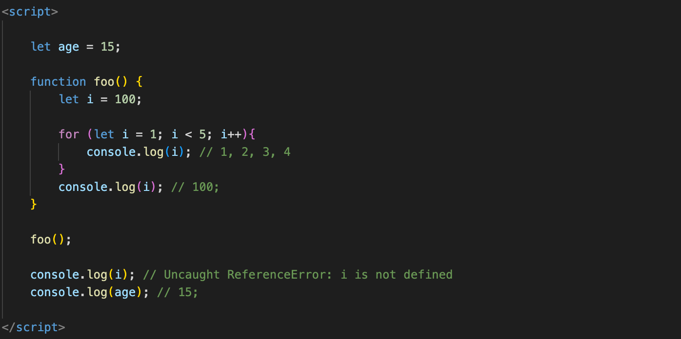두 번째로는 let 혹은 const 키워드로 선언한 변수는 모든 코드 (함수(function), if, for, while, try/catch 등)을 지역 변수로 인정하는 블록 스코프를 따릅니다.