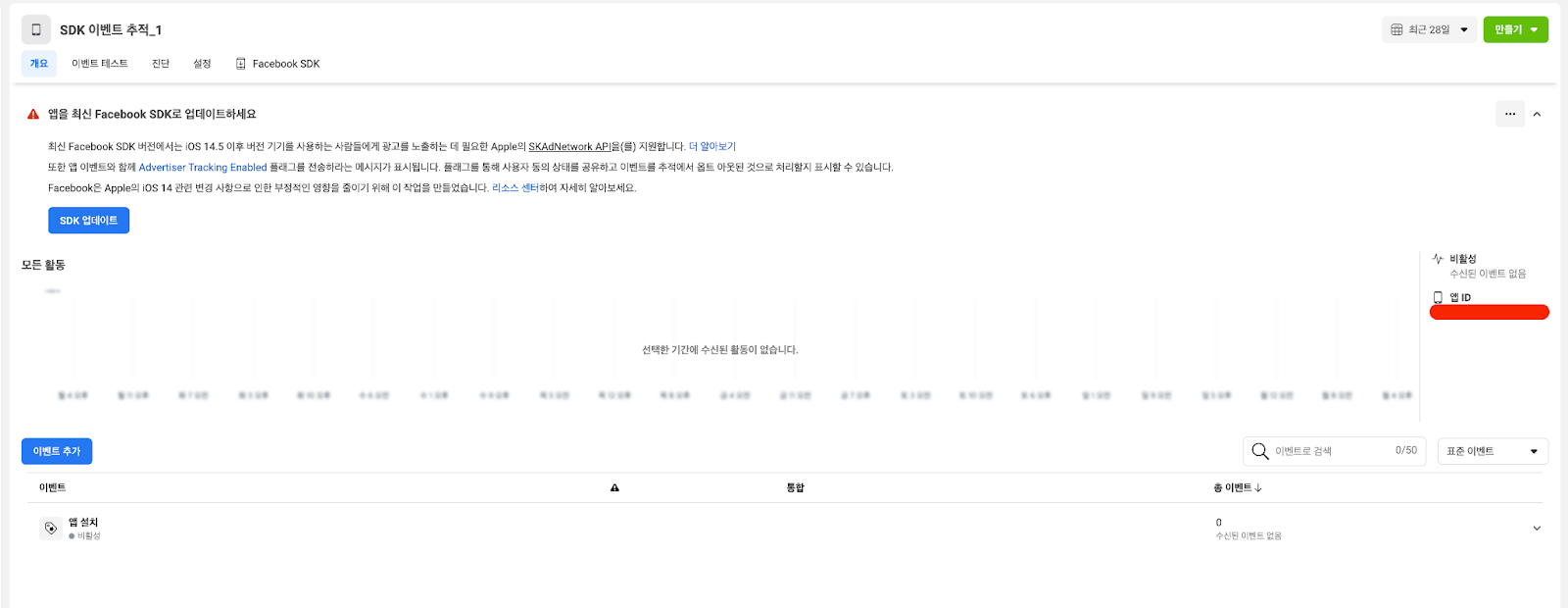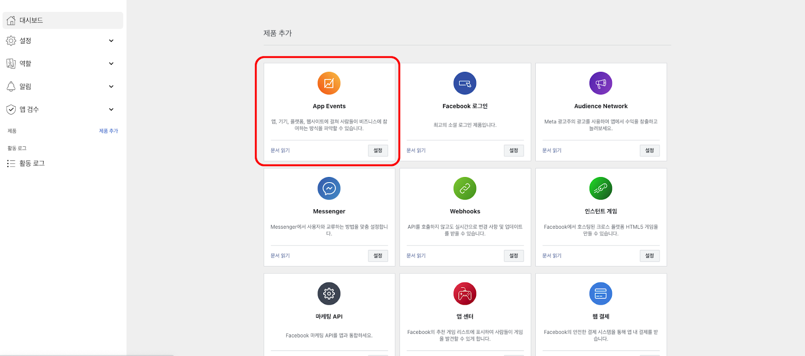 5. 앱이 만들어지면 아래와 같은 페이지로 이동되는데 여기서 App Events 설정을 눌러주세요.
