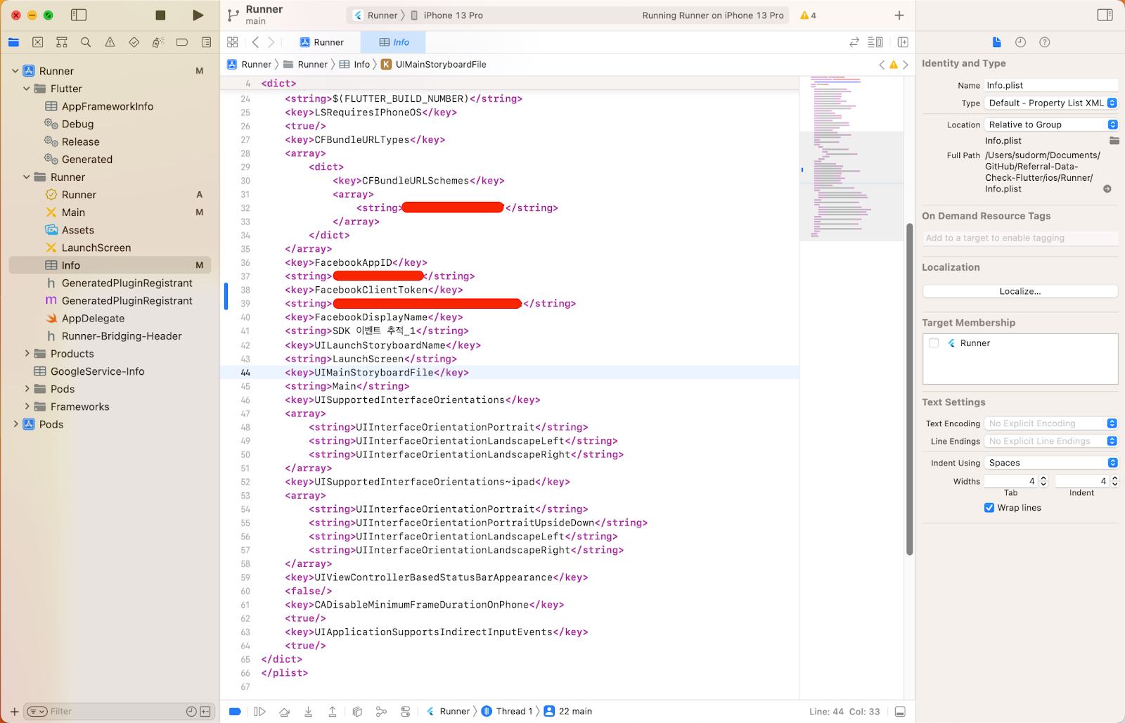 - 추가로 <key>FacebookClientToken</key><string>[CLIENT_TOKEN]</string> 클라이언트 토큰도 같이 넣어주세요.