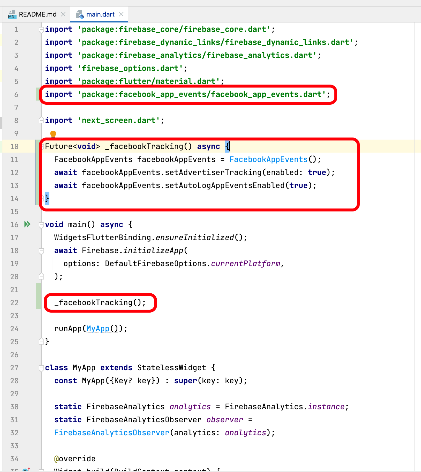 - facebook_app_events 플러그인을 import 해주신 후 실행 코드를 넣어주세요