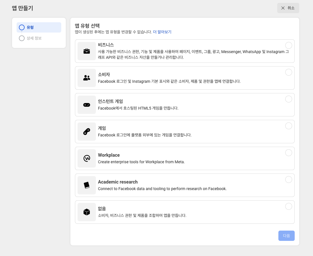 3. 앱 유형을 선택하시면 되는데 저는 설명이 목적이기 때문에 없음을 체크했습니다.