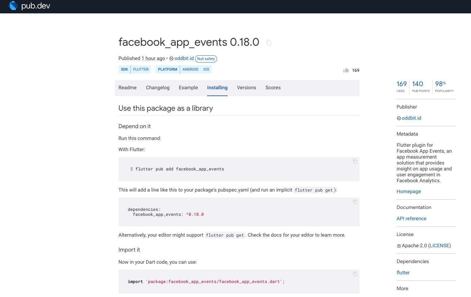9. facebook_app_events 플러그인 (https://pub.dev/packages/facebook_app_events) 접속 후 Installing 클릭 하시면 설치 방법이 나와 있습니다.