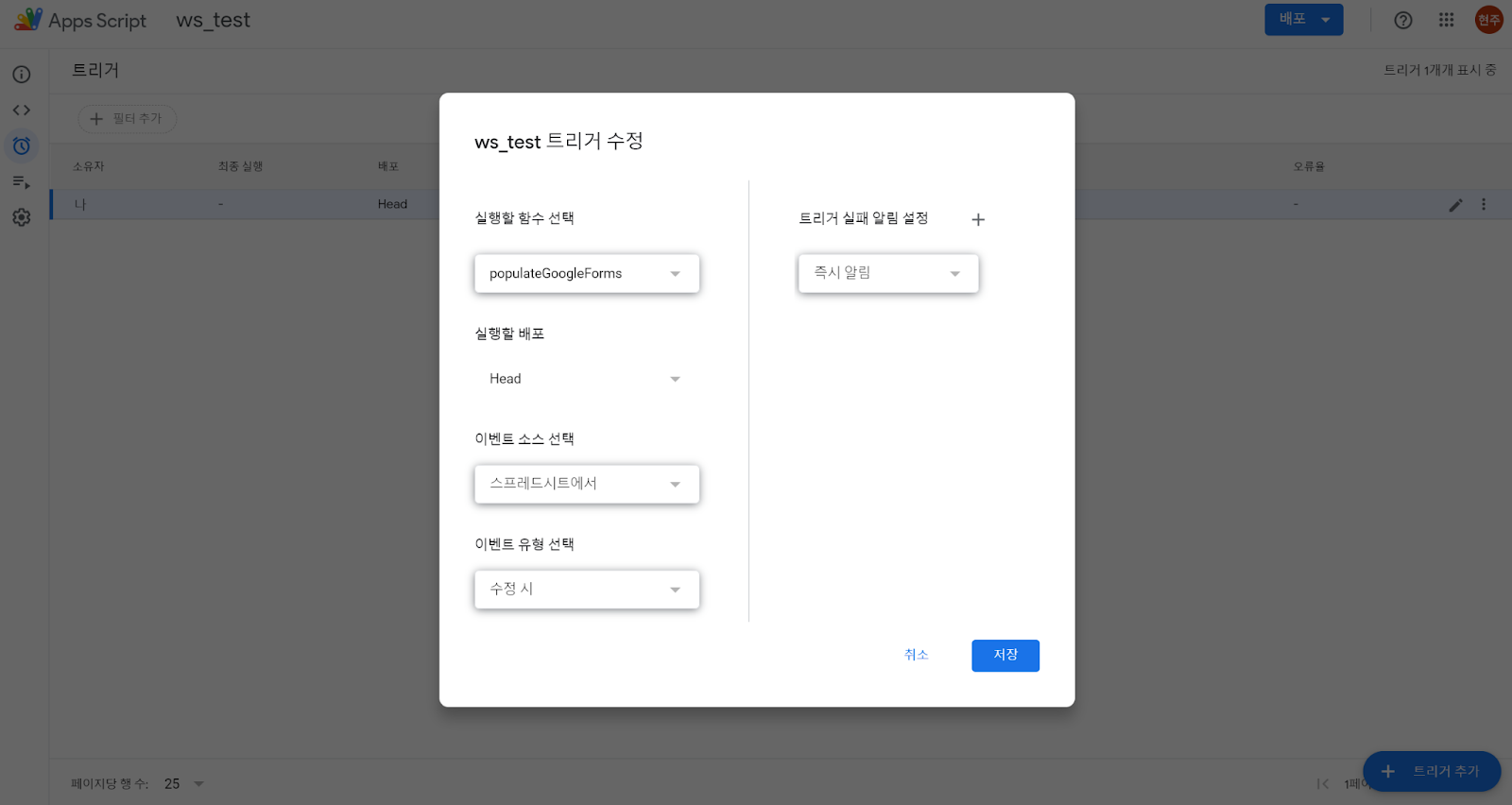 5-2 구글 시트에서 수정할 때마다 구글 폼에서도 수정 내용이 반영되어야 하기 때문에 위 이미지처럼 트리거를 설정하였습니다.