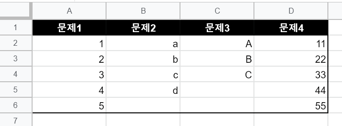 2-1 아래 이미지처럼 1행은 문제, 각 열은 문제에 해당하는 보기 옵션으로 적었습니다.