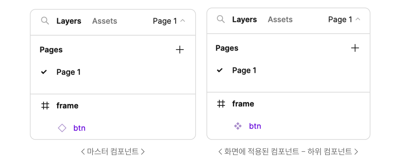 보통 마스터 컴포넌트를 수정하면 화면에 적용된 하위의 컴포넌트들이 일괄적으로 전부 같이 수정됩니다.