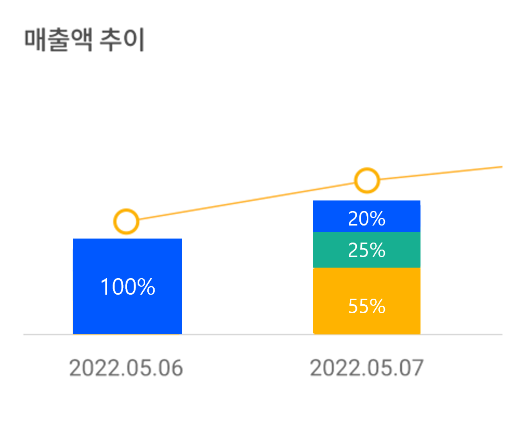 매출액 관련해서 누적 막대그래프를 쓰기 위해 위 그래프를 가져왔습니다. 막대의 전체 길이는 수익을 의미하고 색깔은 플랫폼을 의미합니다. 여기서 비율을 나타내는 데에 한 가지 고민이 생겼습니다.
