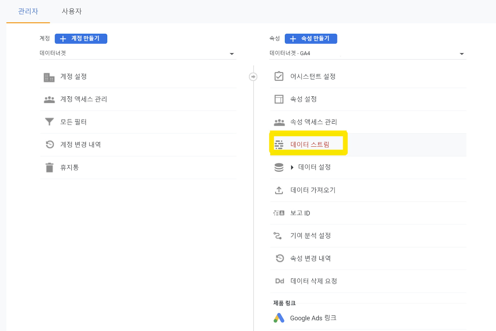 2. 계정 및 속성 페이지가 나오는데 속성에서 [데이터 스트림]을 눌러줍니다.