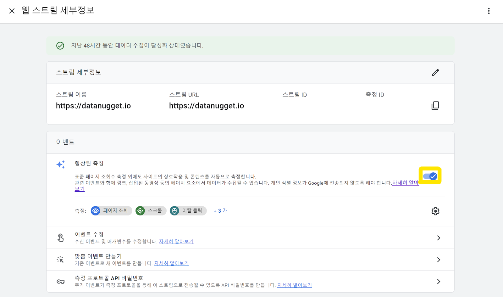4. 그러면 스트림 세부 정보에 대한 내용이 나옵니다. 아래 이벤트에서 향상된 측정 기능을 체크해주시면 활성화가 됩니다. 반대로 버튼을 끄면 비활성화가 됩니다.
