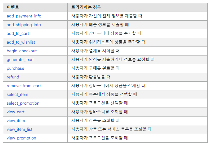 ‘추천 이벤트’는 구글에서 사용자들에게 추천하는 이벤트입니다. 카테고리에 따라 이벤트 목록이 다르고 이벤트명과 매개변수는 지정되어 있습니다. 앞서 나온 이벤트 종류들과 달리 자동으로 수집되지 않는다는 특징을 갖고 있습니다.