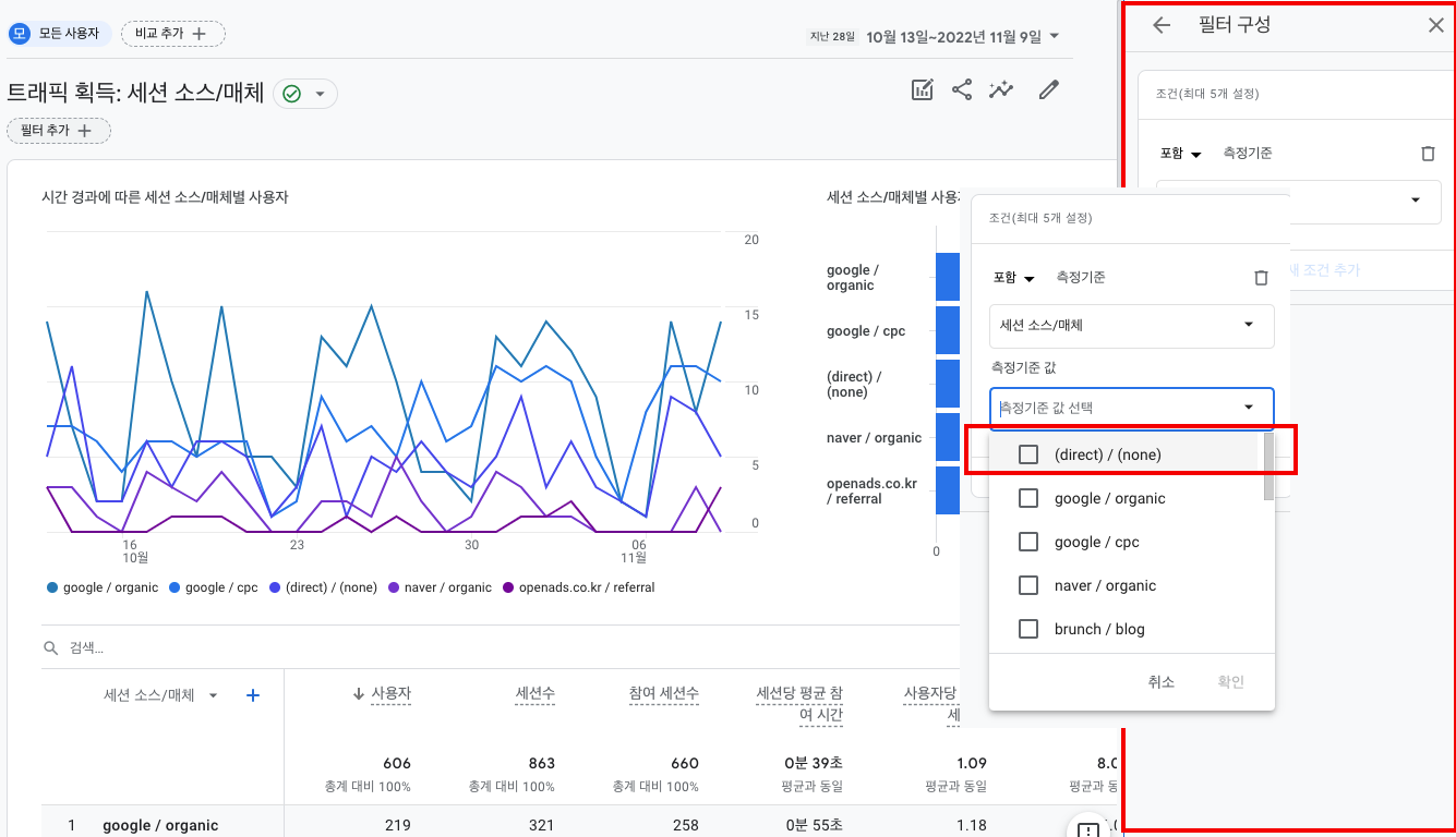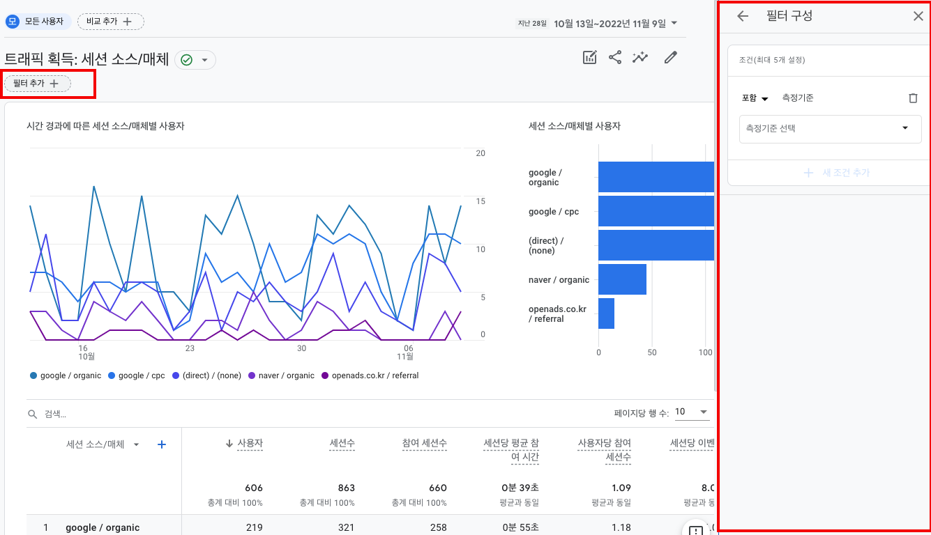 1) 트래픽 획득에서 필터 추가를 누릅니다. 오른쪽으로 세부 설정하는 창이 나올 텐데요.