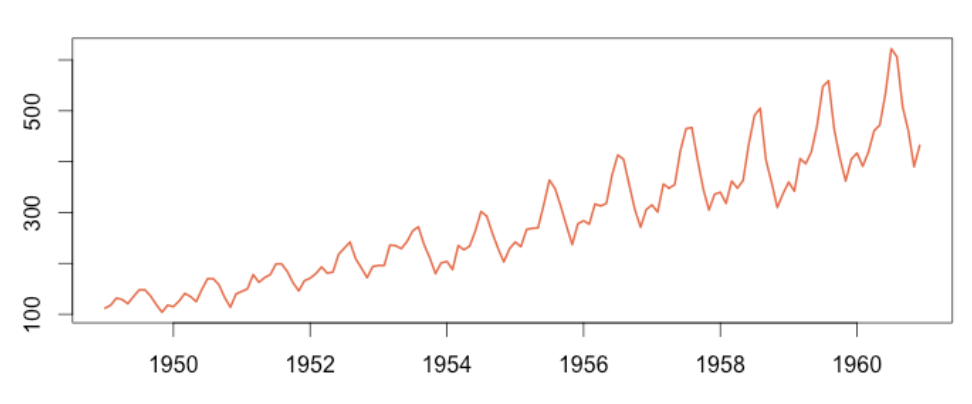 전문적인 설명을 위해 R에서 기본적으로 제공하는 데이터를 가져와 보았습니다. 이 그래프는 항공기 이용 승객수의 변화를 1950년부터 1960년까지 연도별로 보여주는 시계열 그래프입니다.