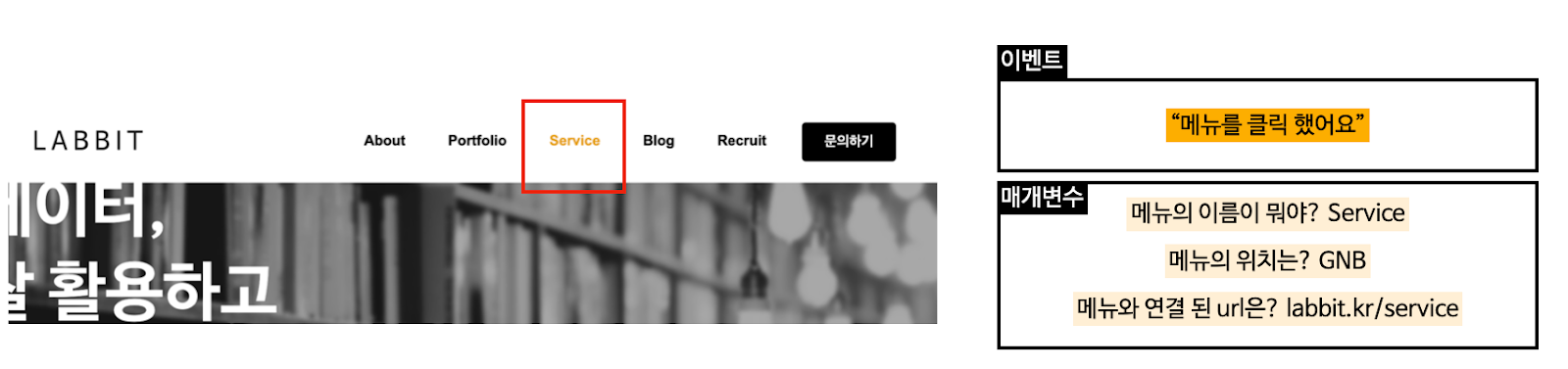 앞서 말씀드린 것처럼 이벤트에 대해 추가적인 정보를 제공하는 경우입니다. 예를 들어 “메뉴를 클릭했다"라는 이벤트가 발생했다면, 매개변수로는 메뉴의 이름, 메뉴의 위치, 메뉴가 연결된 URL 등이 들어갈 수 있어요.