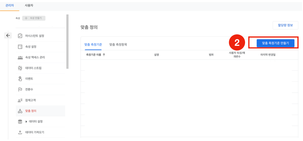 step 2. 나오는 페이지에서 맞춤 측정기준 만들기를 눌러 주세요.