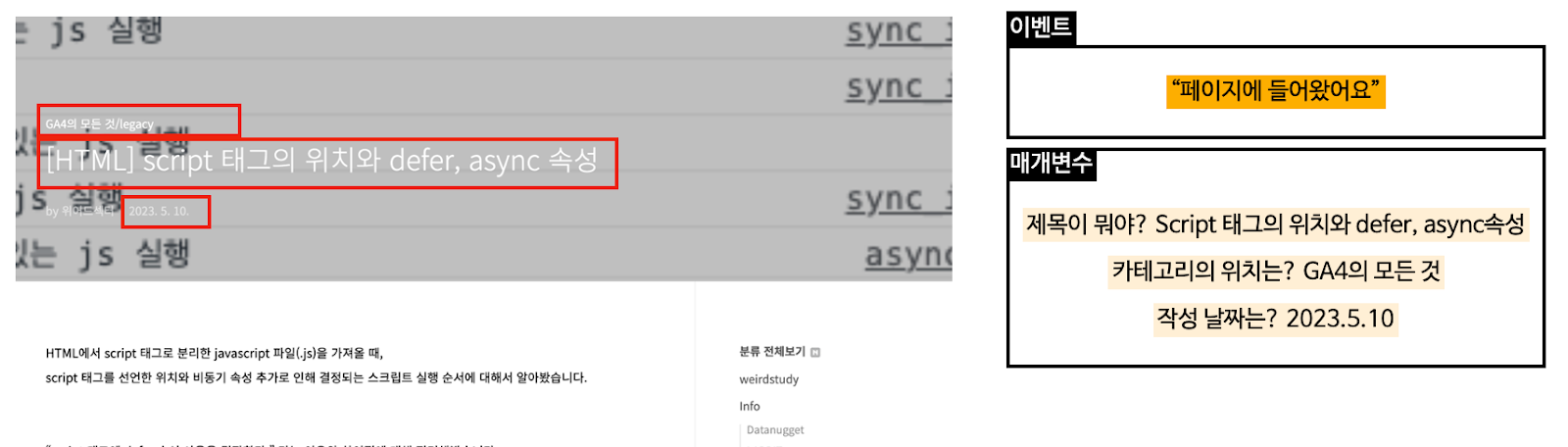 GA4에서는 페이지뷰 또한 이벤트로 처리가 되고 있기 때문에 페이지뷰를 통해 UI에 노출되는 다양한 정보도 매개변수로 잡을 수 있습니다. 예를 들면, 상세페이지 진입 시 제품이름, 제품고유번호, 제품표기 가격, 제품의 설명 등을 가져 올 수 있습니다. 전자상거래 기본 이벤트에서도 이것을 포함하고 있기 때문에 일반이벤트를 기준으로 말씀드리면, 블로그페이지 진입시 콘텐츠의 제목, 콘텐츠 작성 날짜, 콘텐츠의 카테고리 등을 가져올 수 있습니다.
