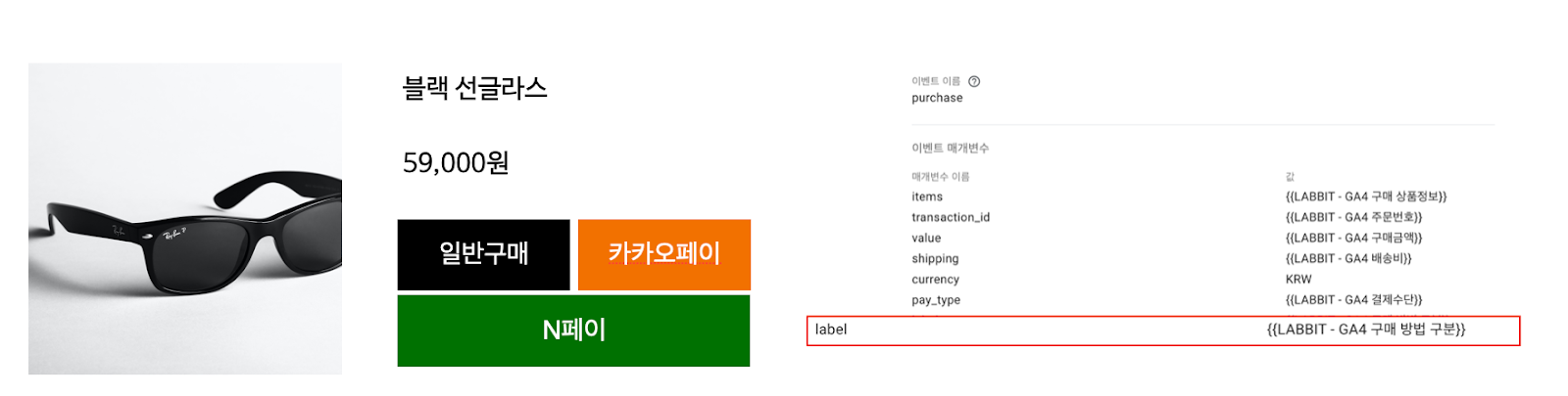 여기 선글라스를 판매하는 사이트가 있습니다. 우리가 가장 궁금한 것은 이 선글라스를 얼마나 구매했는지입니다. 때문에 구매하기(purchase)를 이벤트로 잡았습니다. 최근 간편 결제를 넣었는데 실제로 일반구매, 카카오페이 구매, n페이 구매 중 어떤 방식으로 구매가 주로 일어나는지 궁금합니다.