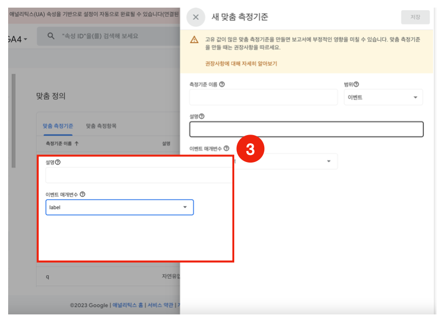 step 3. 이렇게 창이 뜨면 이벤트 매개변수 부분에 태그삽입시 지정한 매개변수를 넣으시면 맞춤 측정기준까지 작업이 끝납니다.