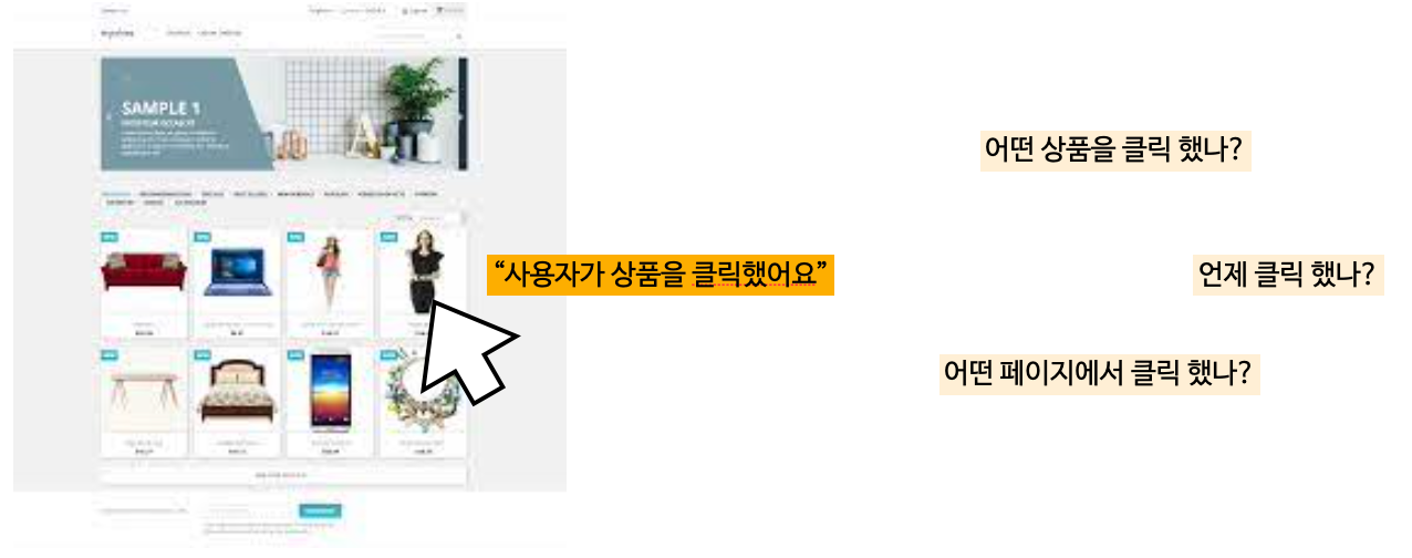 그래서 "사용자가 상품을 클릭했다"라는 이벤트에는 "어떤 상품을 클릭했는지", "언제 클릭했는지", "어떤 페이지에서 클릭했는지" 등의 정보가 매개변수로 추가될 수 있는 것이죠.