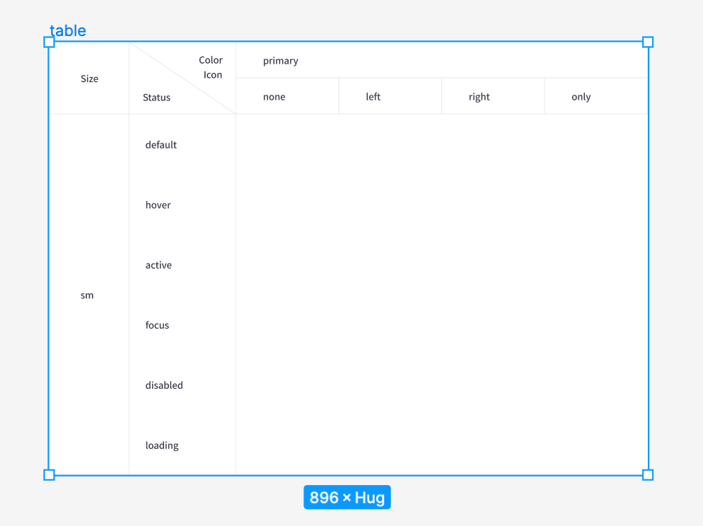 이 과정은 생략해도 되지만, 같이 일하는 사람들에게 어떤 기준으로 정리를 했는지 알 수 있도록 하기 위해 해두는 것이 좋습니다. 만약 table에 auto layout이 적용되어 있다면 해당 frame으로 들어가게 되어 보라색으로 되어 있는 Button component가 사라질 수 있습니다. 이럴 때에는 component를 클릭하고, space bar를 누른 상태에서 frame 위로 올리면 컴포넌트가 auto layout frame에 들어가는 경우를 막을 수 있습니다.