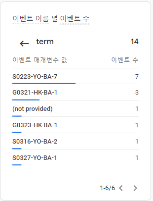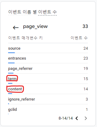 실시간> 이벤트 이름 별 이벤트 수에서 page_view를 클릭하시면 매개변수 키가 term과 content로 수집되고 있는 것을 확인할 수 있습니다!