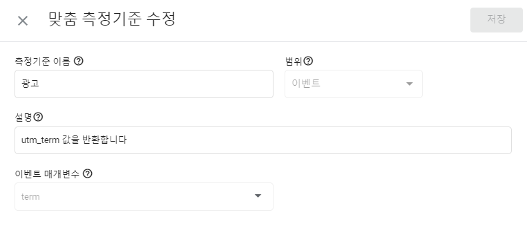- ‘맞춤 측정기준’에서 ‘utm_content’, ‘utm_temr’을 각각 만듭니다.