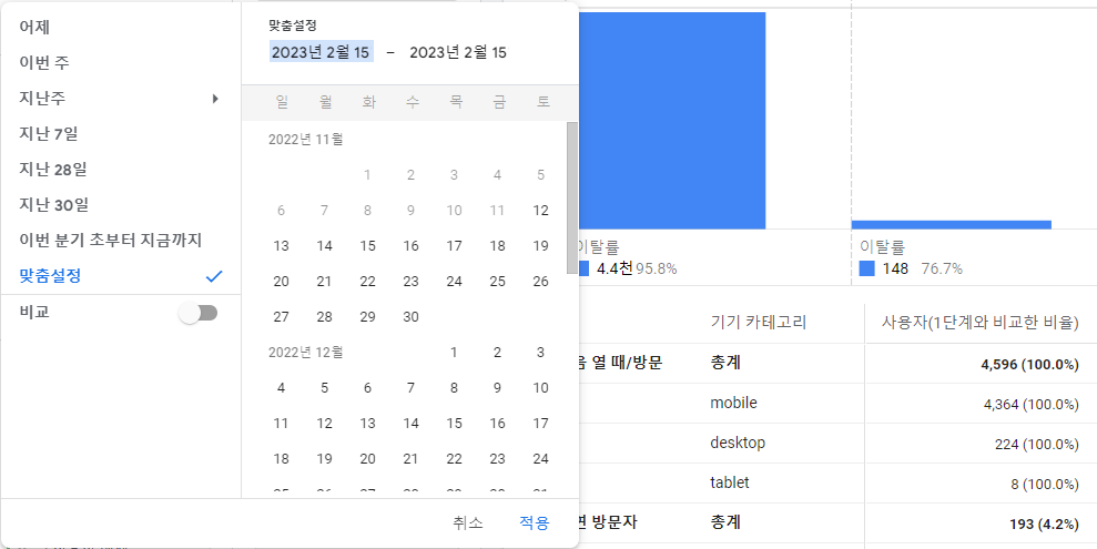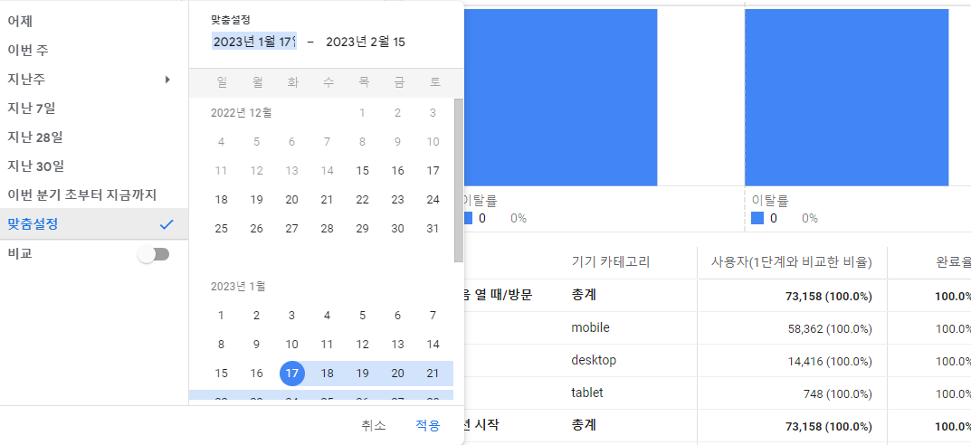 12월 31일까지의 2개월 전인 10월 31일까지의 데이터만 보관되어 있기 때문에, 이경우 2월 16일인 오늘 유입 경로 보고서를 만들면 최대 선택 가능한 기간은 10월 31일~ 2월 16일 것입니다. 이후 23년 12월 31일에는 22년 10월 31일~ 23년 12월 31일의 기간을 모두 사용 가능하겠네요!