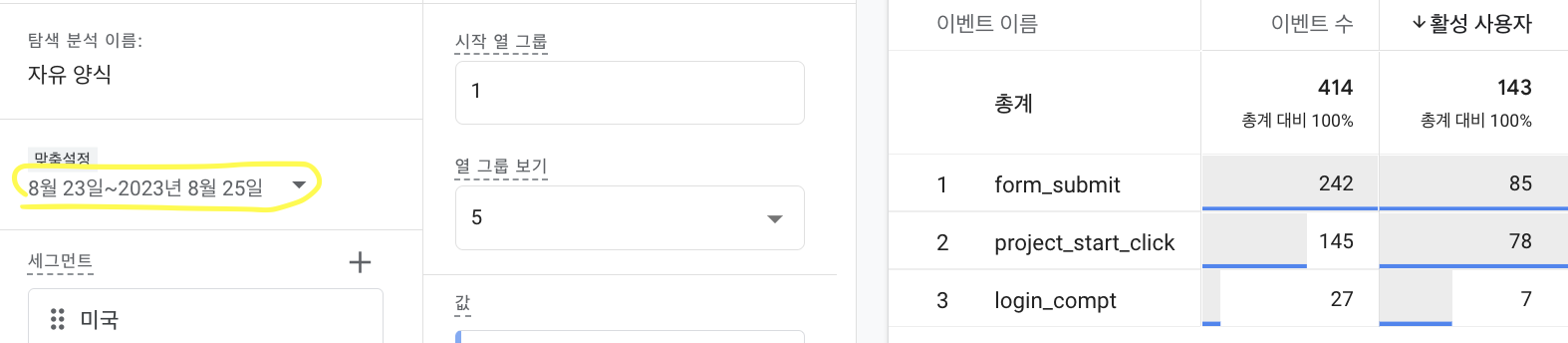 여기서는 123-78명도 45명으로 26일 찍힌 활성 사용자와 동일합니다. 그렇다면 이 의미는 26일 project_start_click을 일으킨 사용자는 모두 새로운 사용자이며, 23,24,25일 중에 2명이 중복된 사용자가 있다는 의미로 볼 수 있을 것입니다. 23일 32명, 24일 17명, 25일 45명이므로 기간으로는 78명이 찍히지만 실제 더한 값은 80명이다.