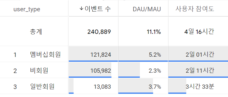 아래 이미지는 예시인데요 멤버십 회원의 DAU/MAU가 가장 높고 사용자 참여도(참여 시간) 은 가장 적은 것을 알 수 있습니다. 그렇다면 한 번 방문 시 사용자의 체류 시간을 늘리기보다 자주 방문할 수 있도록 유도하는 것이 멤버십 회원이 되게 할 확률을 높이는 거라고 할 수 있겠네요!