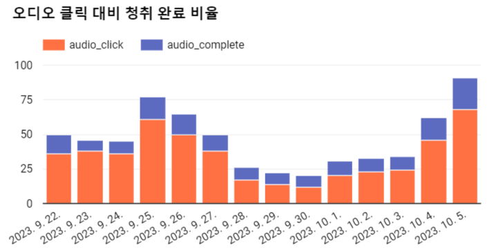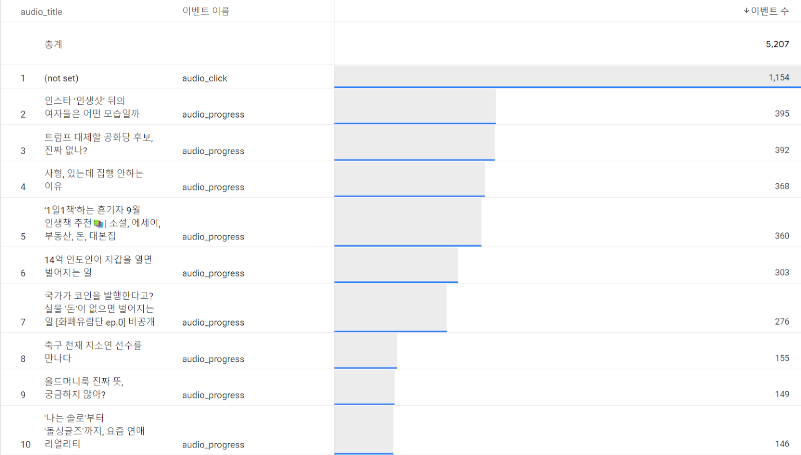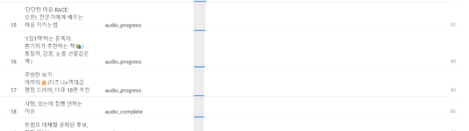 아래 이미지는 하나의 예시로, 오디오 콘텐츠 이름별로 audio_click(오디오 클릭), audio_progress(오디오 1초 이상 청취), audio_complete(오디오 100% 청취)를 구분해서 확인할 수 있습니다.