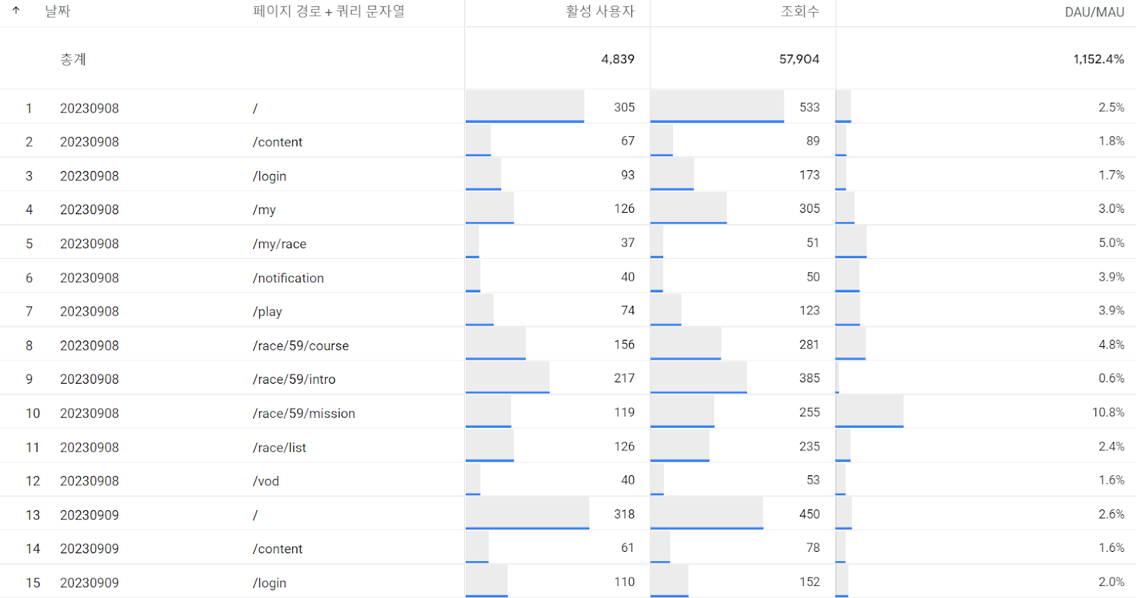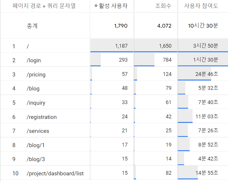 - 해당 페이지의 체류시간(=사용자 참여도/사용자 수)