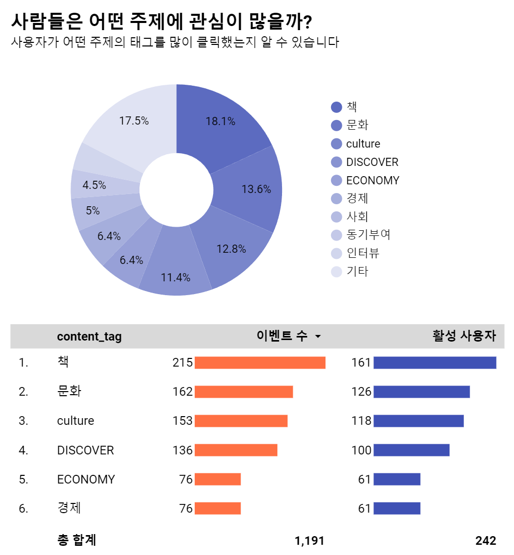 콘텐츠 사이트에서는 사용자들이 좋아할 만한 콘텐츠를 지속적으로 만들어 내야 합니다. 그러므로 1) 어떤 주제에 사용자들이 흥미를 더 많이 느끼는지, 그리고 2) 사용자가 얼마나 자주 콘텐츠를 보기 위해 웹사이트를 방문하는지를 알면 이후 어떤 방향으로 콘텐츠를 추가 생성해야 할지 방향을 잡을 수 있어 굉장히 도움이 많이 됩니다.