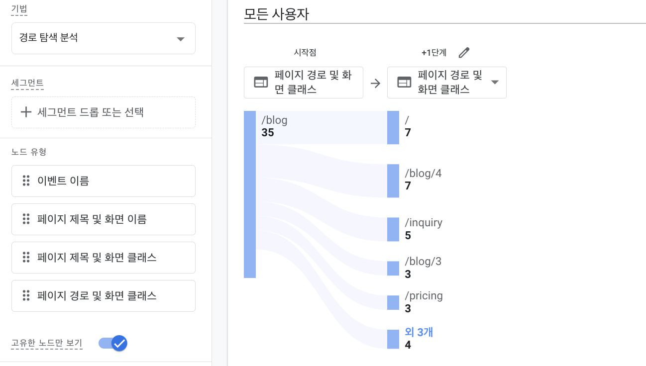 즉 페이지 경로 및 화면 클래스의 시작점을 원하는 위치로 두면 그 위치에서 사용자들이 주로 어디로 이동하는지 확인할 수 있습니다. 보통 사이트의 주요 퍼널을 아는 경우는 퍼널을 만들지만, 처음 사이트를 마주 했을 때 사용자들의 대략적인 행동 흐름을 파악하기 위해 사용하고 있어요.